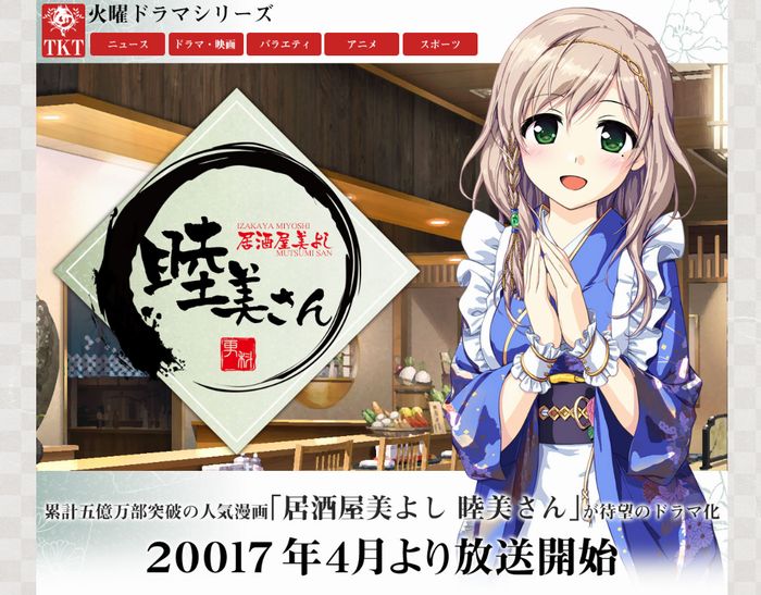 シリーズ累計五億万部の人気コミック「居酒屋美よし 睦美さん」のTVドラマ化が20017年4月に放送決定しました。ティザーサイトがオープン、詳細が決まり次第、情報をお知らせいたします。 https://t.co/iR15KVQAiC pic.twitter.com/HDVbm6XxoS