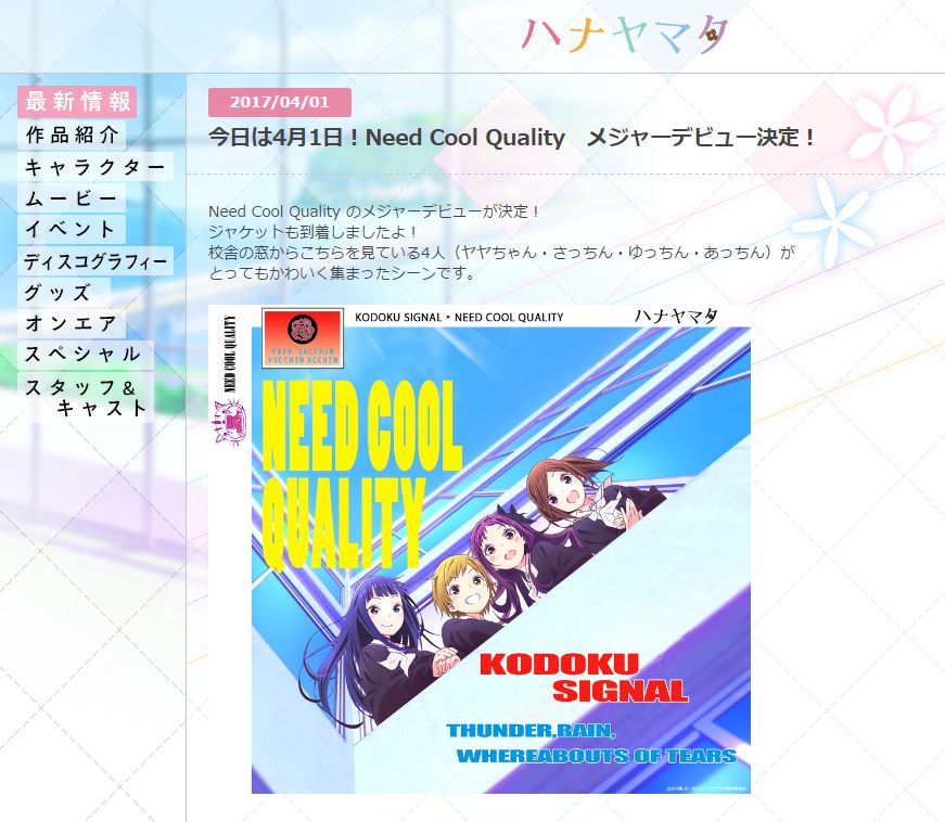 — ハナヤマタ 公式★晴鳴五子路発売中! (@hanayamata_PR) 2017年3月31日