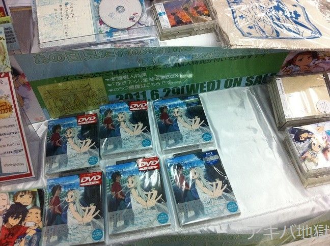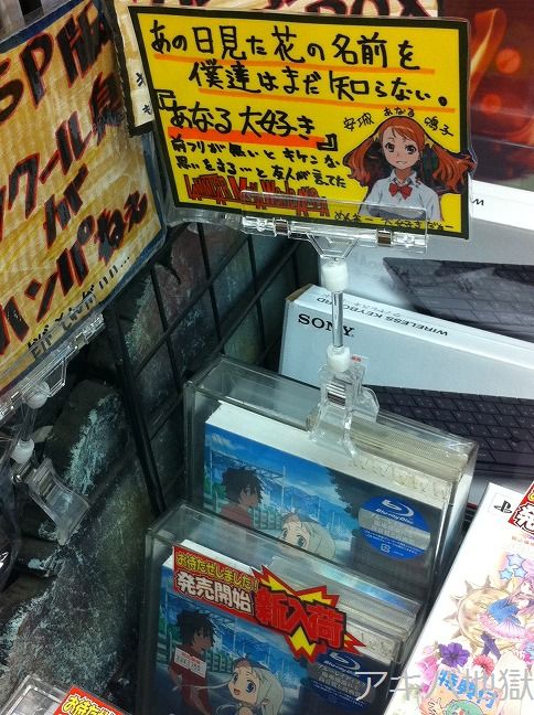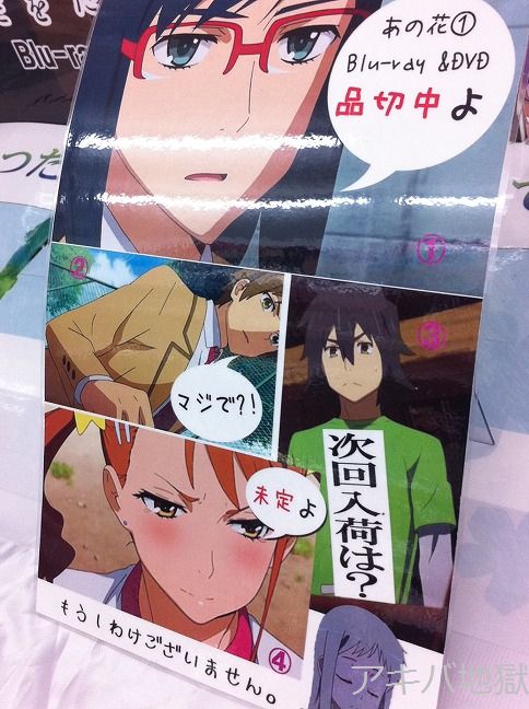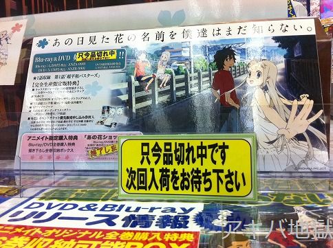 6月30日のアキバ巡回中、秋葉原のお店では「あの日みた花の名前を僕たちはまだ知らない。」1巻のBDやDVDが完売するお店が現れはじめた。「あの花」BD&DVD1巻は先日28日に発売したばかり。そんな中、ソフマップアミューズメント館の中の人は、BDパッケージを持って、あの花巡礼をしに行ったらしい。▼とらのあな秋葉原BのPOP「あの花①Blu-ray&DVD 品切中よ」「次回入荷は?」「未定よ」