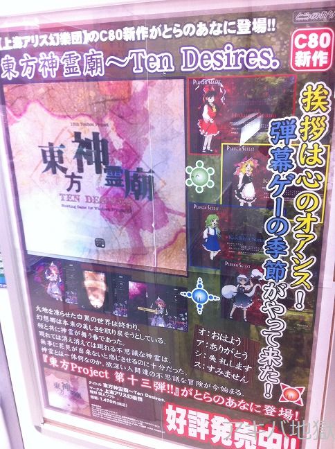 特設サイトによると、『大地を凍らせた白黒の世界は終わり、幻想郷は本来の美しさを取 り戻そうとしている。桜と共に神霊が舞う春であった。現れては消え消えては現れる不思議な神霊は、無事に花見が出来ないと感じさせるのに十分だった。神霊とは一体何なのか、欲深い人間達の不思議な冒険が今始まる。』『東方Project 第十三弾!!「東方神霊廟 ~ Ten Desires.」は、いつものゆるいキャラ達が、弾幕となると突然切れ者になるシューティングゲームとなっています。』ってな話。メロンブックス秋葉原店では『ネタバレに怯える日々は遂に終わりを告げる・・・当方神霊廟ショップ委託開始です!』なんてPOPがついてた。
