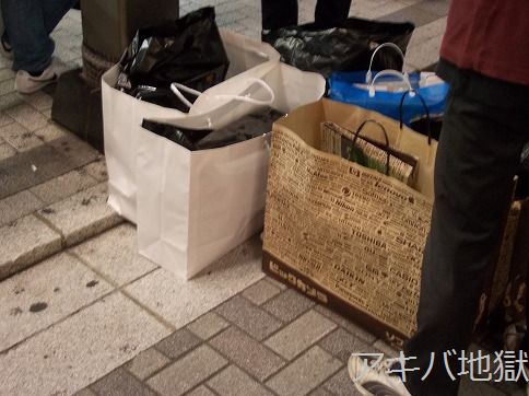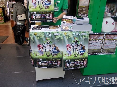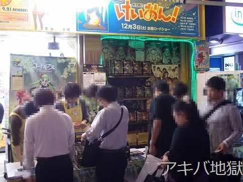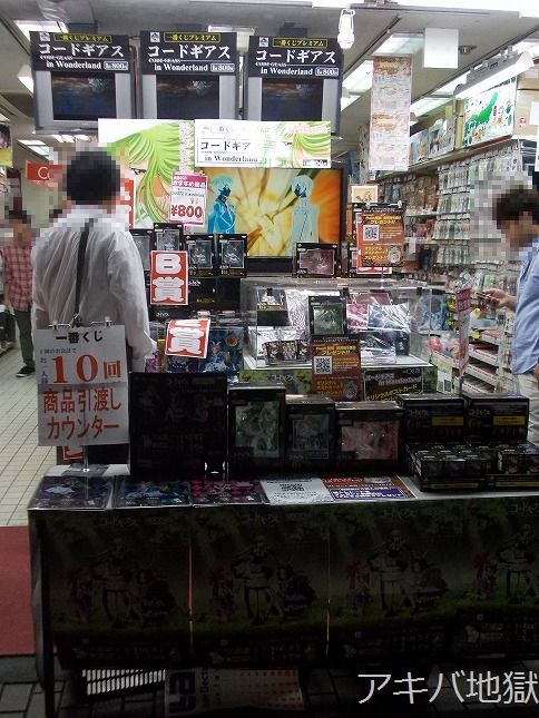 台風の影響で発売日が延期になってた一番くじプレミアム『コードギアス in Wonderland』が27日に発売になった。秋葉原では、とらのあな、ボークス、ゲーマーズ、アソビットシティが路上販売をしてて、特にゲーマーズ本店の前には景品の入った袋を大量に置いてる人が多く見受けられた。アソビットシティのPOPには「もう一度、買え。先ほどのように。一度だけだ。大切に、優しく心をこめてな。」なんて書いてあったり。
