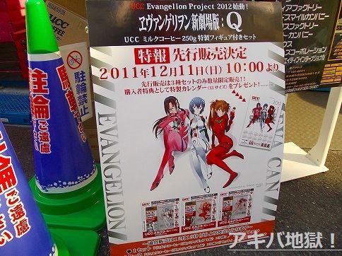 「ヱヴァンゲリヲン新劇場版:Q」のUCCミルクコーヒー250g特製フィギュア付きセット【AA】をコトブキヤ秋葉原館で11日に先行販売してた。販売はコトブキヤ店頭で10時から開始されるも、販売開始から2時間ほどで完売しちゃったとか。購入者特典として特製カレンダーのプレゼントもしてたんだって。