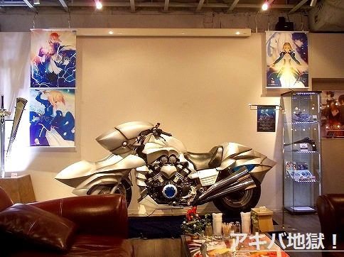 松戸グッドスマイルカフェでは10月12日から「フェイト/タイプムーンカフェ」がやってるんだけど、今月15日から「Fate/Zero」登場予定の「セイバー・モータード・キュイラッシェ」実物大バイクが登場されるということで、見てきた。