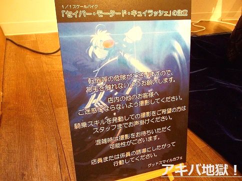 今回はアキバを離れ、松戸グッドスマイルカフェに21日まで展示される「Fate/Zero」登場予定の「セイバー・モータード・キュイラッシェ」実物大バイクを見てきた。