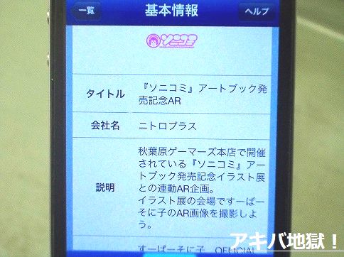 すーぱーそに子公式サイトによると、『AKIHABARAゲーマーズ本店5Fにて開催中の「ニトロプラスフェスタ 2011-12」第1弾「アートブック発売記念イラスト展」会場にて、“ソニコミ”アートブック発売記念ARイベントが実施されます! 2011年12月28日(水)〜2012年1月3日(火)の間、イラスト展会場内に設置されているARマーカーにお手持ちのスマートフォンをかざすと、“すーぱーそに子”が出現します!出現するそに子ちゃんは全部で5種類。もちろん撮影も可能です!!ご来場の際は、ぜひお試しください♪』ってな話。
