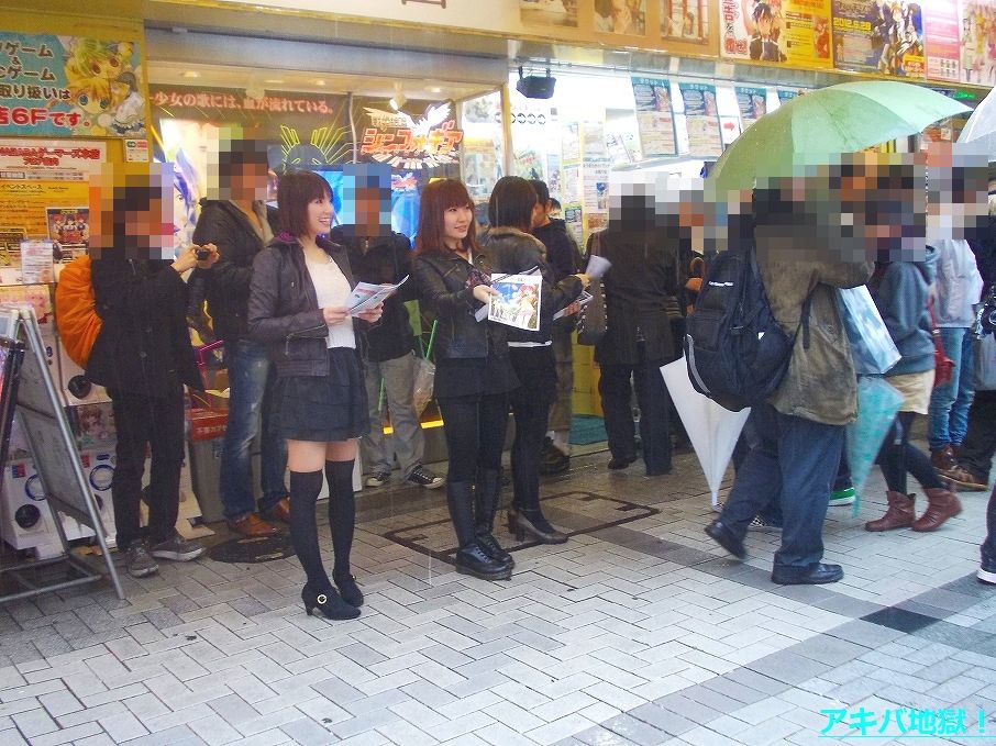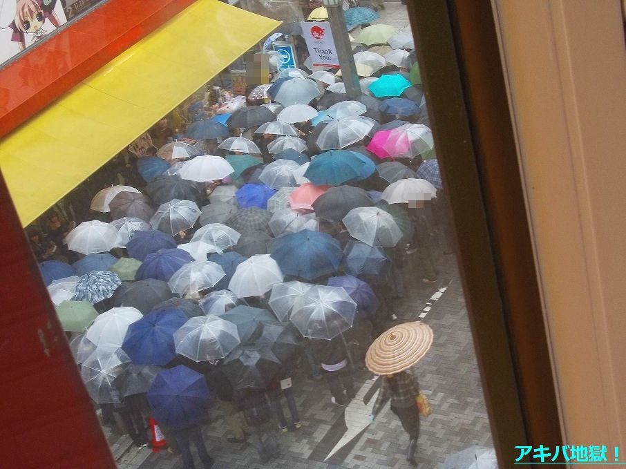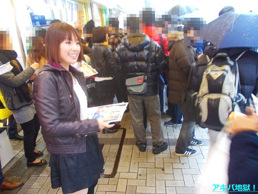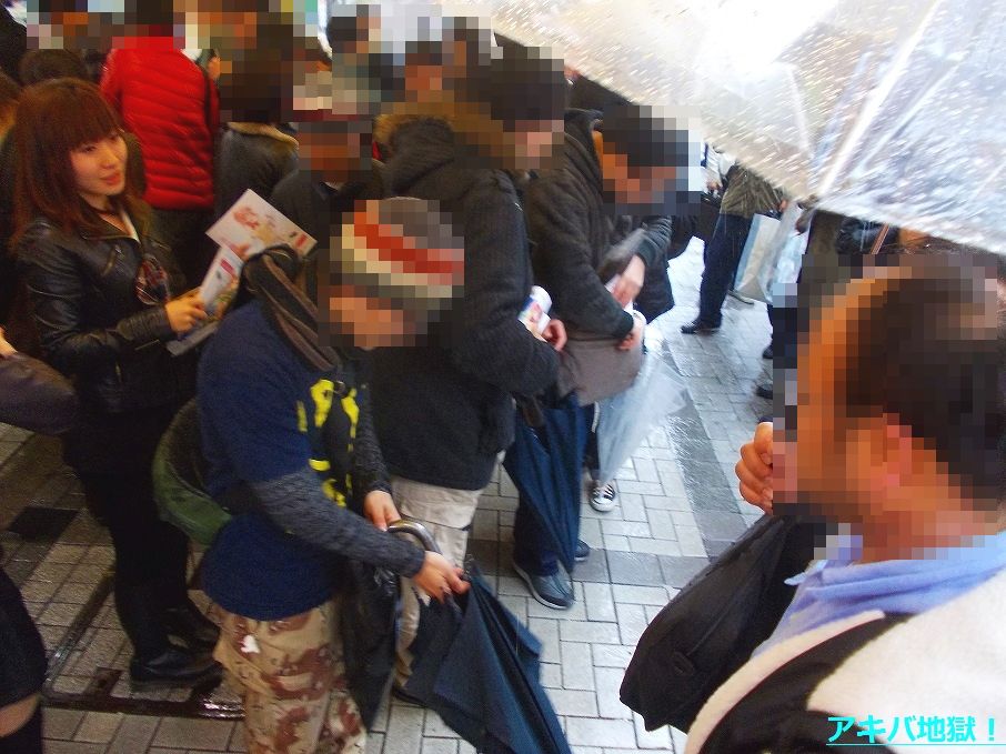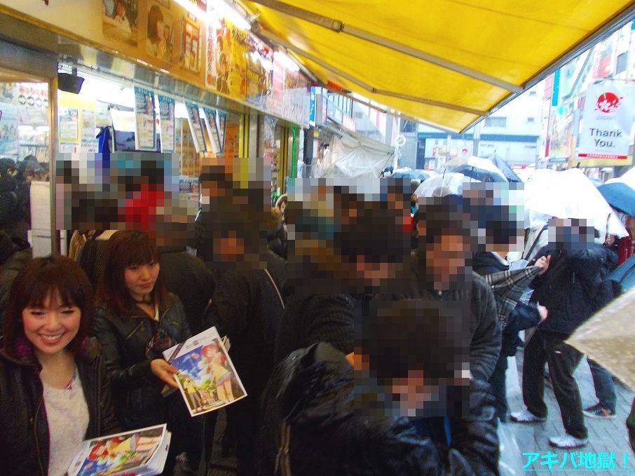 お配り会が開始される直前の店頭には多くの人だかりができ(列は作ってなかった)、この日は雨でみな傘を差してることもあって混雑した状態に。去年10月のシュタゲ配布会ほどではなかったけど、この混雑はお配り会開始から十数分間ほど続いてた。