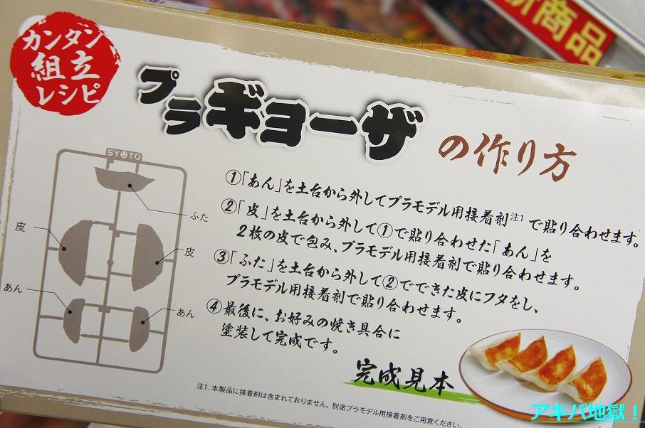裏面の『カンタン組立レシピ プラギョーザの作り方』によると、『①「あん」を土台から外してプラモデル用接着剤で貼り合わせます。』『②「皮」を土台から外して①で張り合わせた「あん」を2枚の皮で包み、プラモデル用接着剤で貼り合わせます。』『③「ふた」を土台から外して②でできた皮にフタをし、プラモデル用接着剤で貼り合わせます。』『④最後に、お好みの焼き具合に塗装して完成です。』な流れで作るみたいで、店員さんの話によると、中に説明書は入ってないらしいw