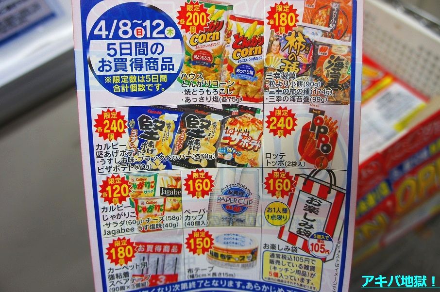 また、オープンする8日から12日の5日間はお買い得商品を販売するとかで、ビラには「ハウスとんがりコーン」とか「カルビー堅あげポテト」「ロッテトッポ」「カルビーじゃがりこ」など書いてた(無くなり次第終了)。8日朝10時からオープンするとか。