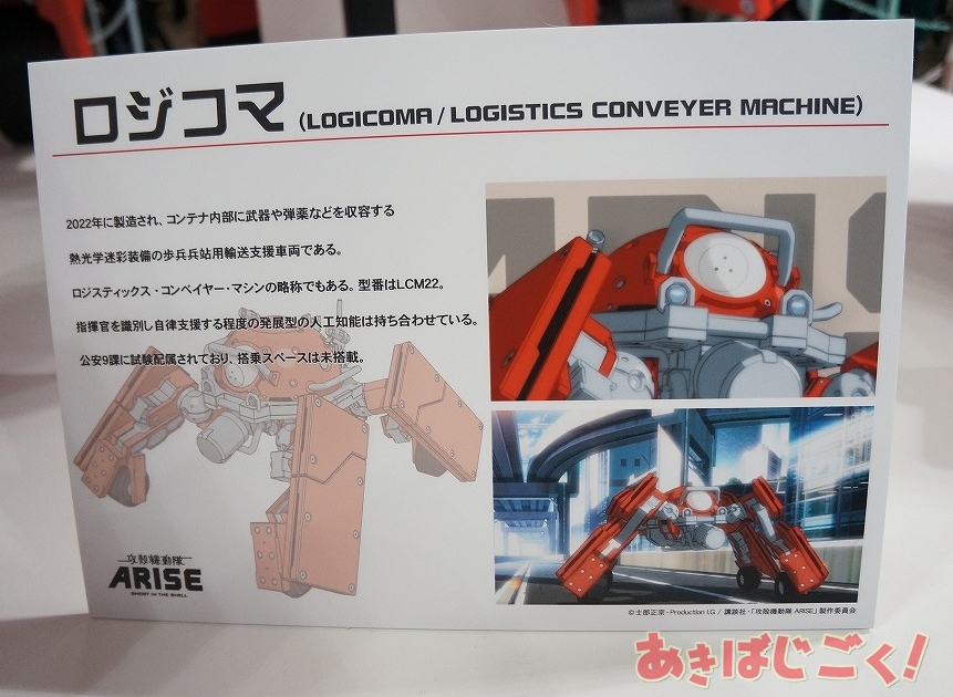 漫画版に登場する“フチコマ”や「攻殻機動隊 STAND ALONE COMPLEX」シリーズに登場する“タチコマ”とはまた違うもののようで、紹介パネルによると『2022年に製造され、コンテナ内部に武器や弾薬などを収容する熱光学迷彩装備の歩兵兵帖用支援車両である。