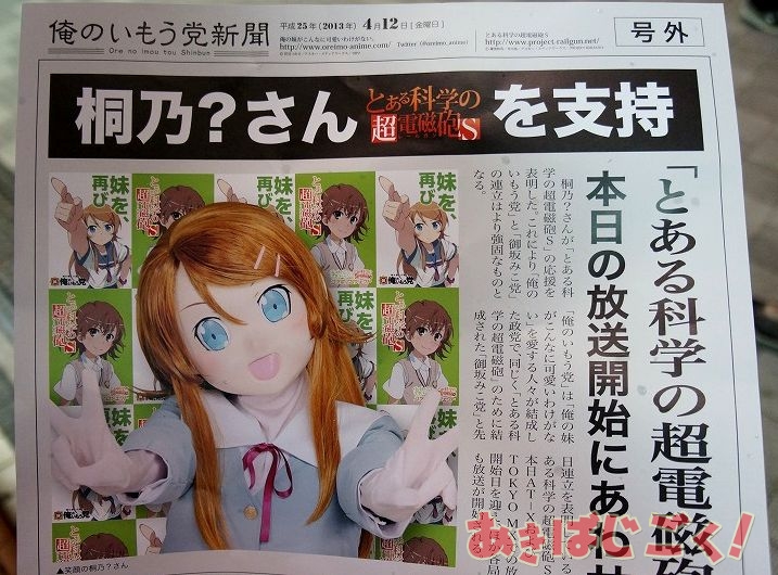 「超電磁砲」と「俺妹」は先日、「俺のいもう党」と「御坂みこ党」が連立を表明したとのことで、今回はその関係で“桐乃?”さんが応援に駆けつけてきた模様。