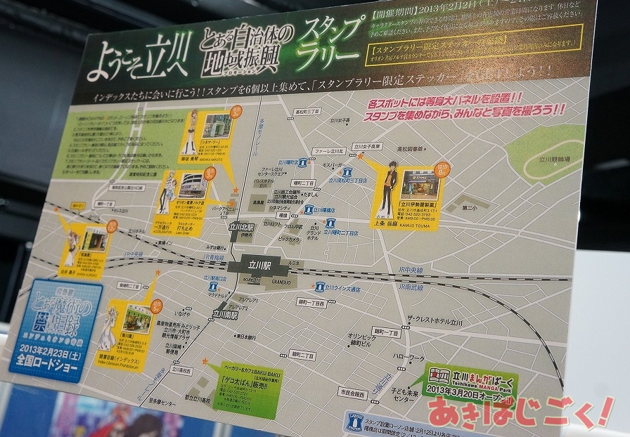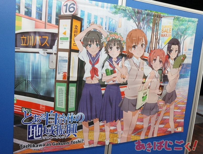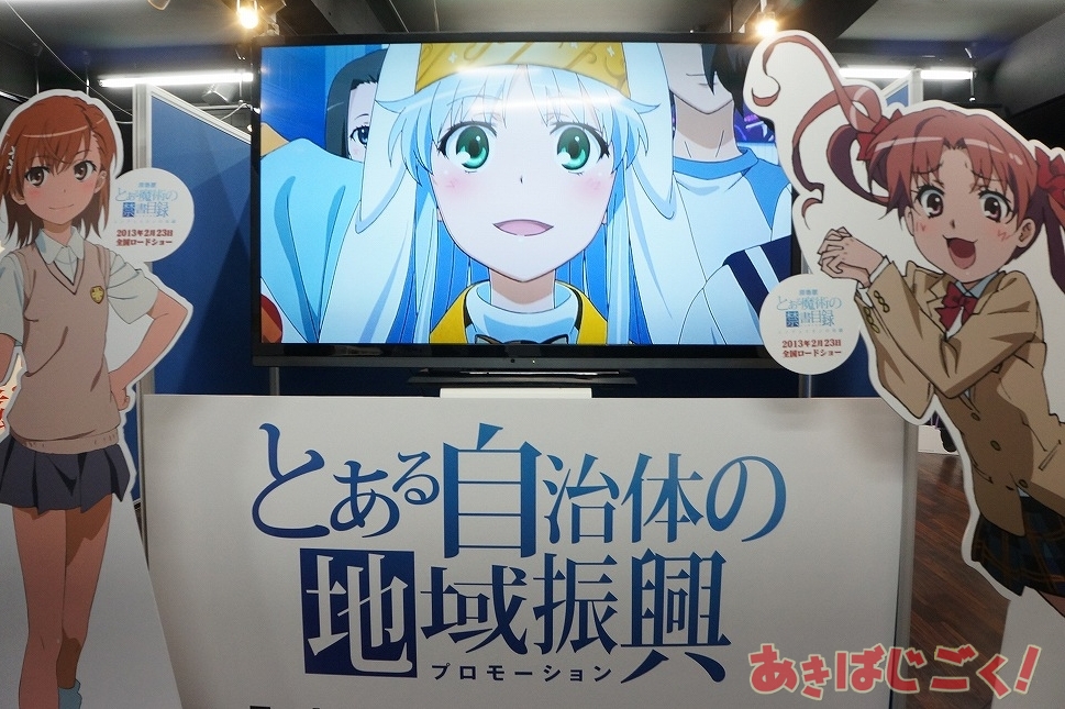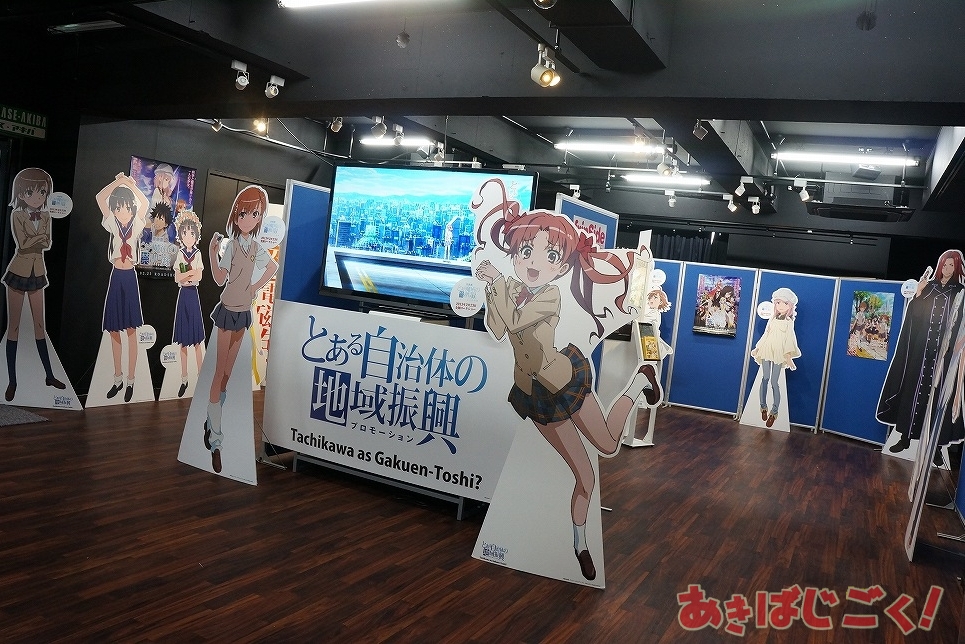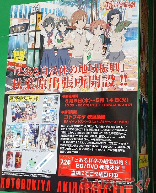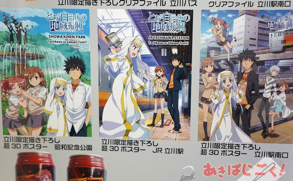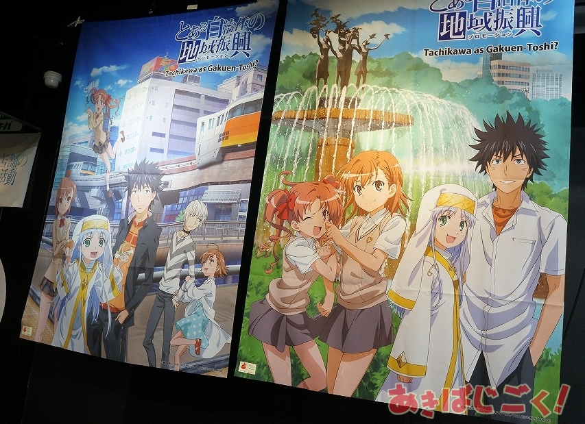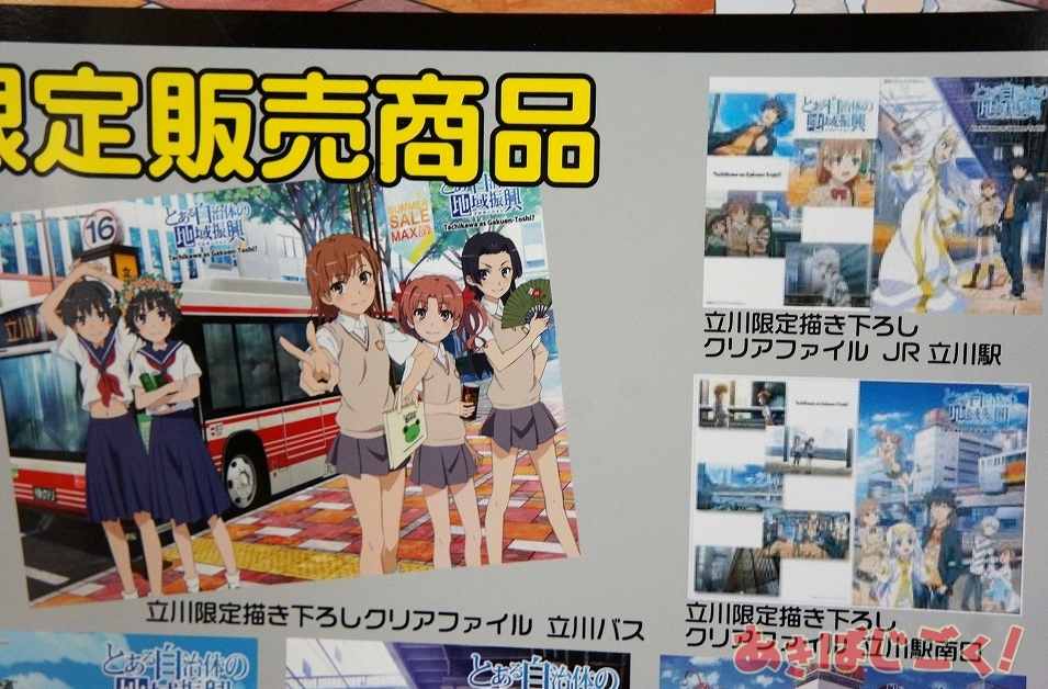 この出張所は、アニメも放映中の「とある科学の超電磁砲S」の作中舞台である立川で行われてるイベント「とある自治体の地域振興」の限定アイテム販売が行われているもので、「立川限定 とある自治体の地域振興クリアファイル3種」「立川限定 超3Dポスター3種」「立川限定 美琴と黒子の黒豆サイダー貯金箱」「とある店舗の販促活動ローソン制服ゲコ太ストラップ」といったラインナップを販売。