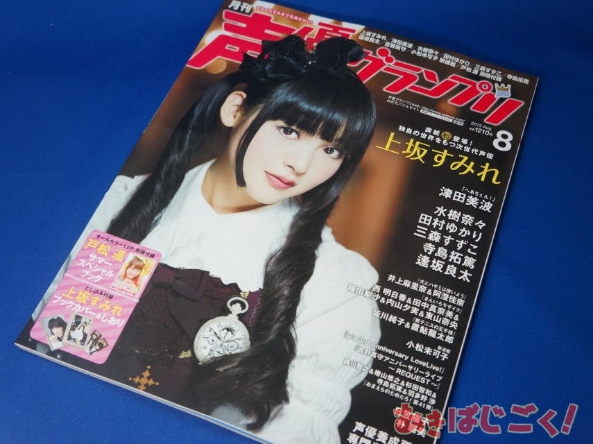 10日に発売してる「声優グランプリ」8月号(AA)では、上坂すみれさんが表紙・巻頭特集を飾り、とじ込み付録としてブックカバー&しおりが付くほか、別冊付録として「戸松遥サマースペシャルブック」も用意される。