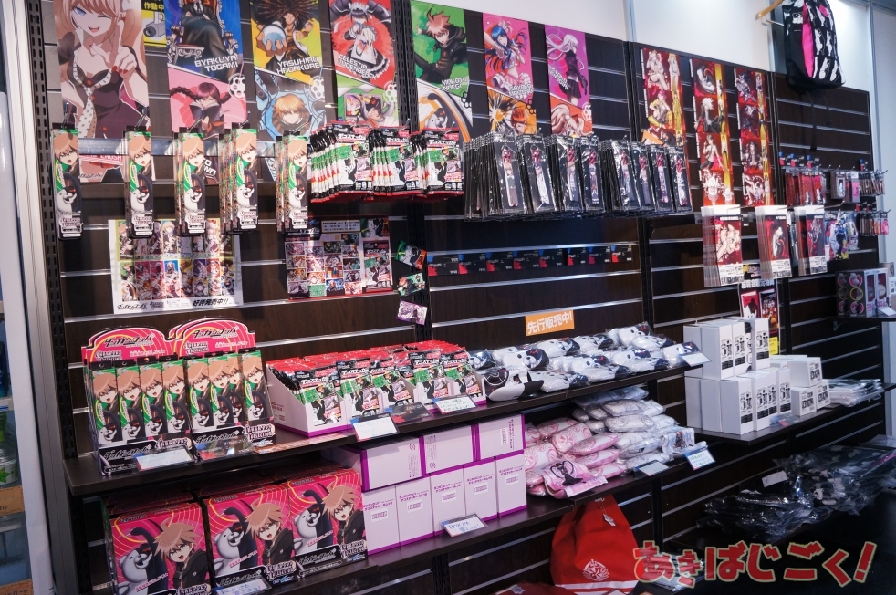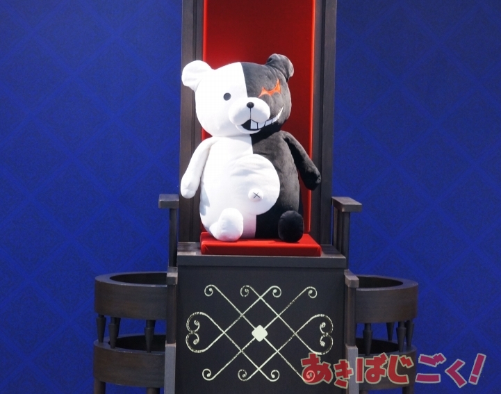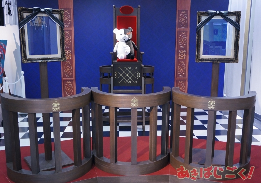 会場では設定資料やイラストなどの展示のほか、モノクマが座る玉座や証言台を立体化して学級裁判のシチュエーションを1/1で再現したものなどあり、関連商品の先行・限定グッズ販売も行われてる。