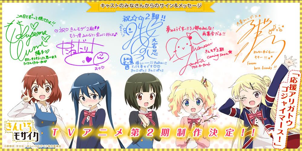 嬉しいお知らせです!「きんいろモザイク」の続編は、TVアニメ第2期に決定しました!皆さんからの応援があったからこそですo(^▽^*)人(*^▽^)oアリガトウゴジャイマース! http://t.co/pYRX4dsqMC #kinmosa