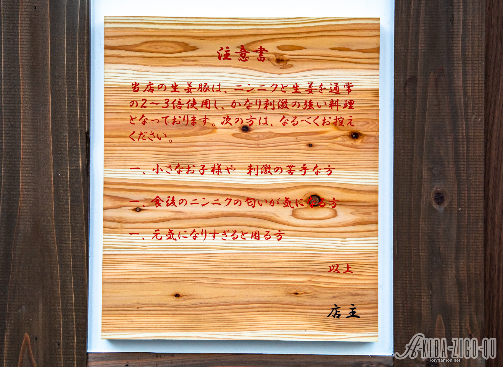 」当店の生姜豚は、ニンニクと生姜を通常の2~3倍使用し、かなり刺激の強い料理となっております。次の方は、なるべくお控えください。