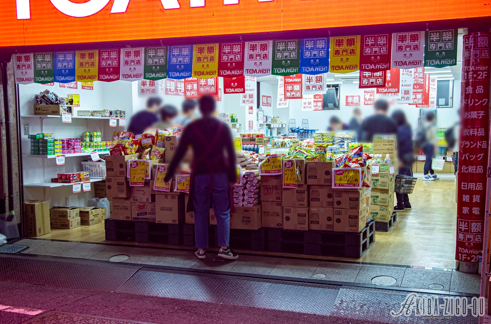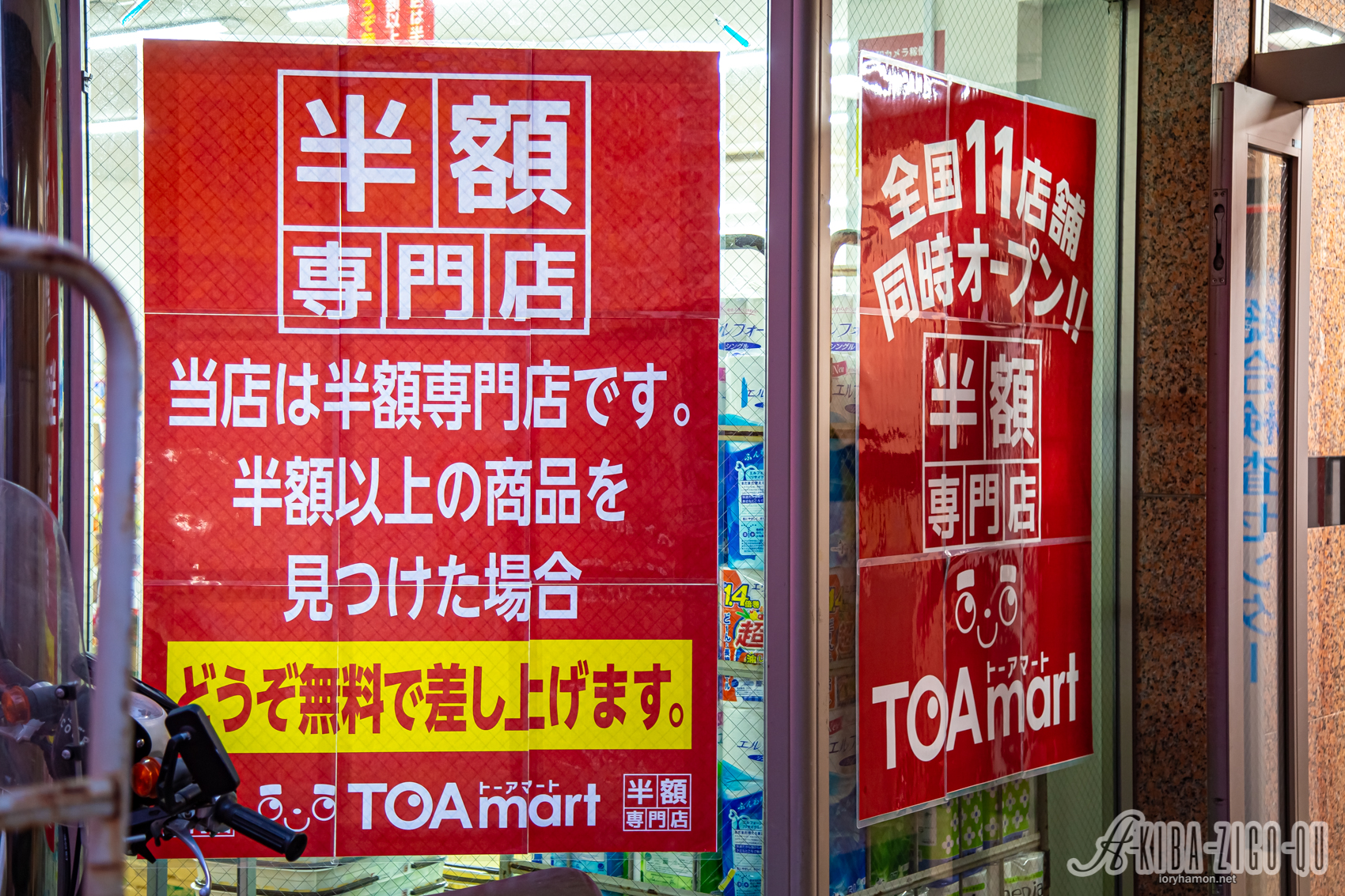 店頭の謳い文句によると「当店は半額専門店です。半額以上の商品を見つけた場合 どうぞ無料で差し上げます」「全国11店舗同時オープン!!」とのことで、日用品・食品・雑貨・家電・衣類・化粧品といったものを揃えるディスカウント店になる様子。